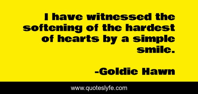 This page presents the quote "I have witnessed the softening of the hardest of hearts by a simple smile.". Author of this quote is Goldie Hawn. This quote is about simple, hearts, hardest,.