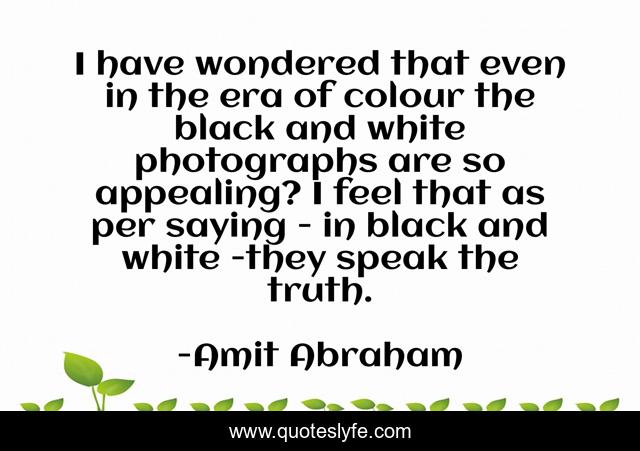 This page presents the quote "I have wondered that even in the era of colour the black and white photographs are so appealing? I feel that as per saying - in black and white -they speak the truth.". Author of this quote is Amit Abraham. This quote is about truth-of-life, truth-telling, black-and-white-photo,.