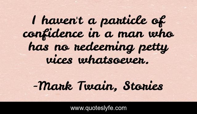 This page presents the quote "I haven't a particle of confidence in a man who has no redeeming petty vices whatsoever.". Author of this quote is Mark Twain, Stories. This quote is about character, virtue, vice,.