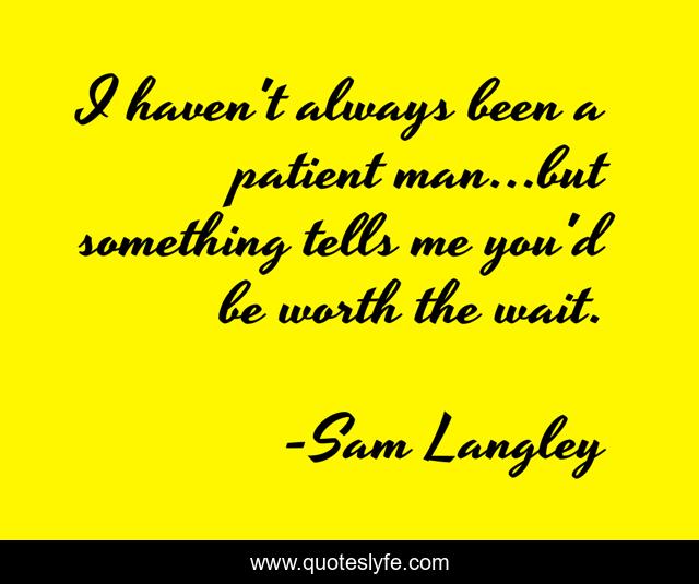 This page presents the quote "I haven't always been a patient man...but something tells me you'd be worth the wait.". Author of this quote is Sam Langley. This quote is about women-s-fiction, co-workers-in-love, cozy-mystery, romantic-suspense,.