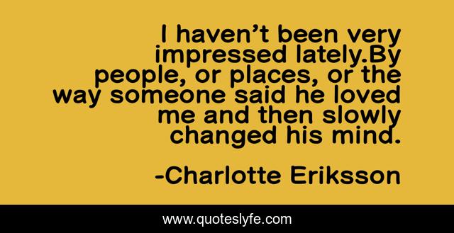 This page presents the quote "I haven’t been very impressed lately.By people, or places, or the way someone said he loved me and then slowly changed his mind.". Author of this quote is Charlotte Eriksson. This quote is about impressed, life, love, places, people, heart-break, charlotte-eriksson, mind, poetry,.