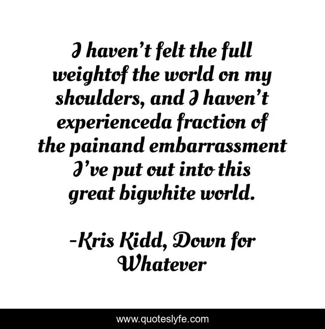This page presents the quote "I haven’t felt the full weightof the world on my shoulders, and I haven’t experienceda fraction of the painand embarrassment I’ve put out into this great bigwhite world.". Author of this quote is Kris Kidd, Down for Whatever. This quote is about embarrassment, guilt, pain,.