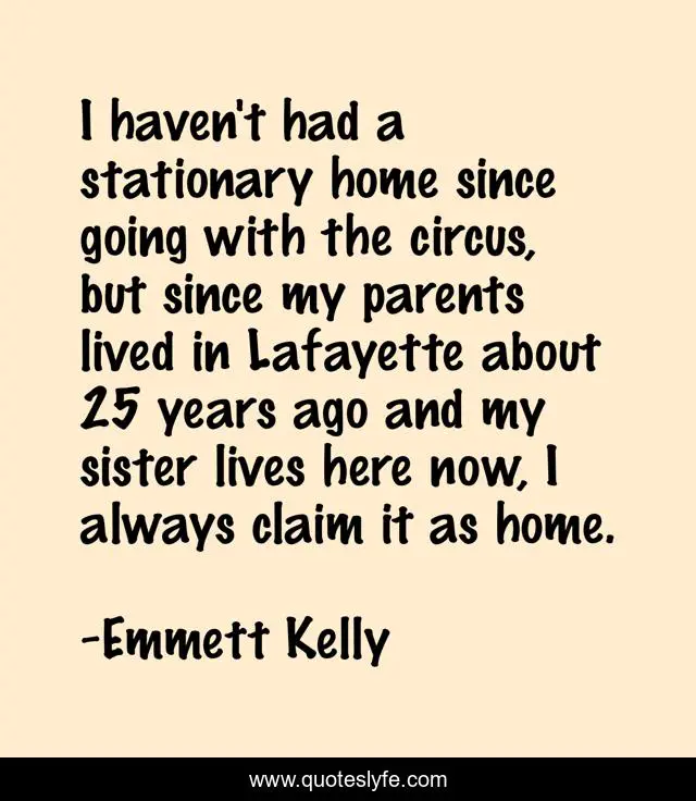 This page presents the quote "I haven't had a stationary home since going with the circus, but since my parents lived in Lafayette about 25 years ago and my sister lives here now, I always claim it as home.". Author of this quote is Emmett Kelly. This quote is about sister, circus, parents,.