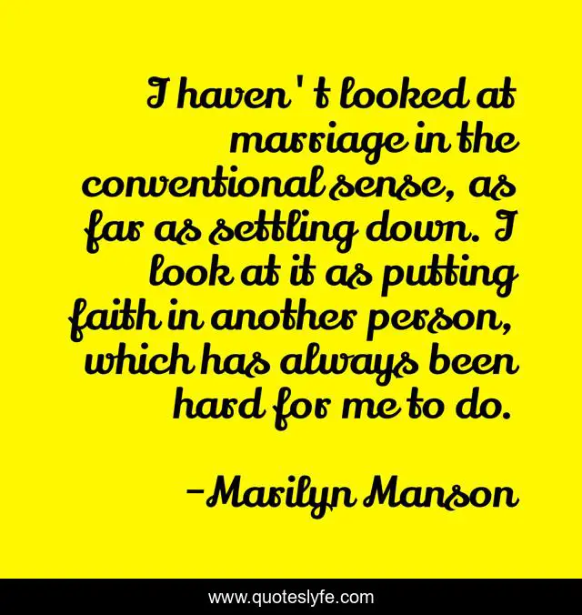 This page presents the quote "I haven't looked at marriage in the conventional sense, as far as settling down. I look at it as putting faith in another person, which has always been hard for me to do.". Author of this quote is Marilyn Manson. This quote is about me, marriage, look,.