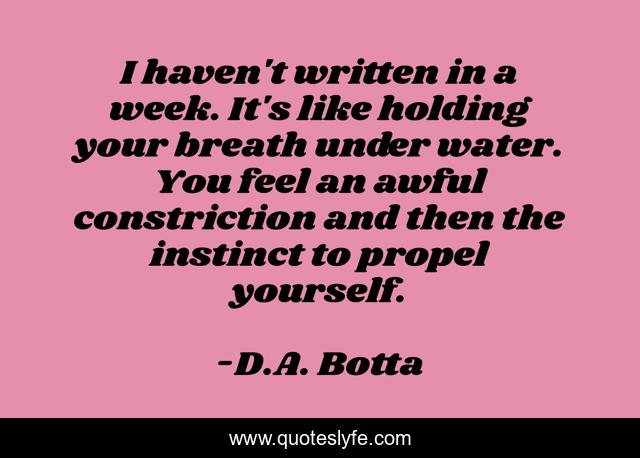 This page presents the quote "I haven't written in a week. It's like holding your breath under water. You feel an awful constriction and then the instinct to propel yourself.". Author of this quote is D.A. Botta. This quote is about writers-block, writer, writist, writing,.