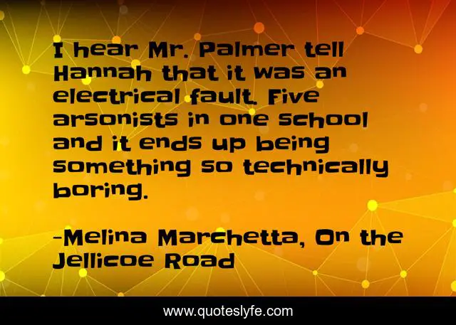 This page presents the quote "I hear Mr. Palmer tell Hannah that it was an electrical fault. Five arsonists in one school and it ends up being something so technically boring.". Author of this quote is Melina Marchetta, On the Jellicoe Road. This quote is about funny, irony, comedy,.