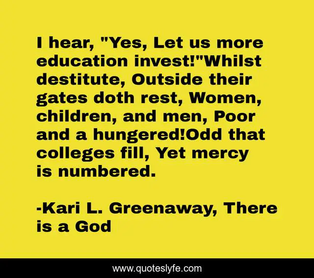 This page presents the quote "I hear, "Yes, Let us more education invest!"Whilst destitute, Outside their gates doth rest, Women, children, and men, Poor and a hungered!Odd that colleges fill, Yet mercy is numbered.". Author of this quote is Kari L. Greenaway, There is a God. This quote is about education-system, mercy, college-degree, destitute,.