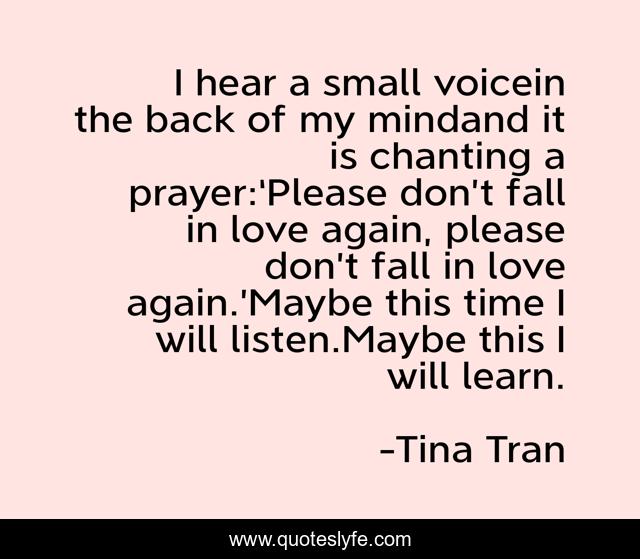 This page presents the quote "I hear a small voicein the back of my mindand it is chanting a prayer:‘Please don’t fall in love again, please don’t fall in love again.’Maybe this time I will listen.Maybe this I will learn.". Author of this quote is Tina Tran. This quote is about hurt, love, plea, affection, learn,.