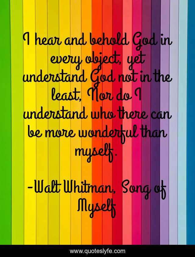 This page presents the quote "I hear and behold God in every object, yet understand God not in the least, Nor do I understand who there can be more wonderful than myself.". Author of this quote is Walt Whitman, Song of Myself. This quote is about atheism, god, religious, walt-whitman, religion,.