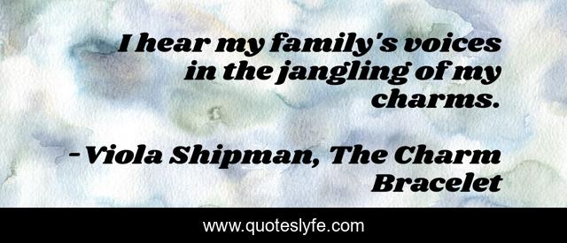 This page presents the quote "I hear my family's voices in the jangling of my charms.". Author of this quote is Viola Shipman, The Charm Bracelet. This quote is about faith, love, family, thecharmbracelet, charm-bracelet, family-love, charms, affection,.