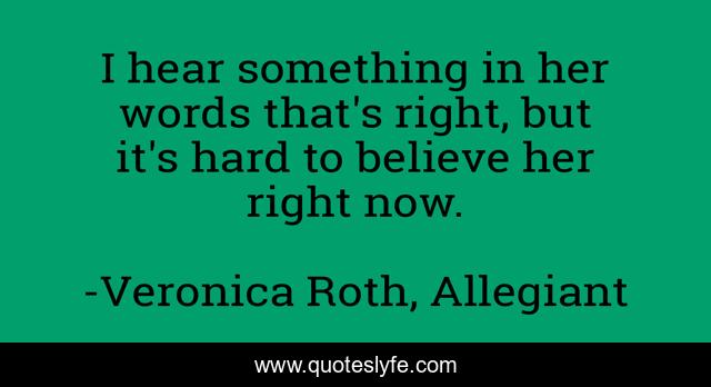 This page presents the quote "I hear something in her words that's right, but it's hard to believe her right now.". Author of this quote is Veronica Roth, Allegiant. This quote is about believe, trust,.