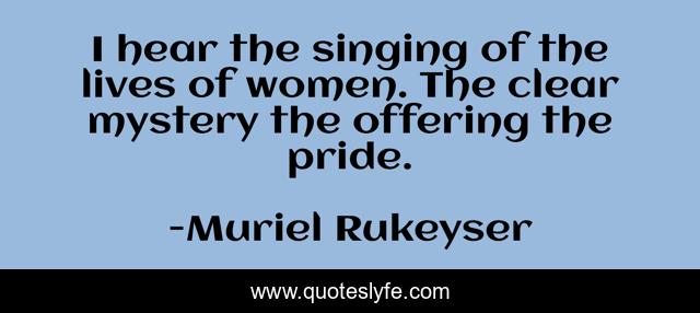 This page presents the quote "I hear the singing of the lives of women. The clear mystery the offering the pride.". Author of this quote is Muriel Rukeyser. This quote is about self, knowledge,.