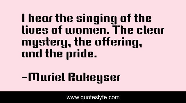 This page presents the quote "I hear the singing of the lives of women. The clear mystery, the offering, and the pride.". Author of this quote is Muriel Rukeyser. .