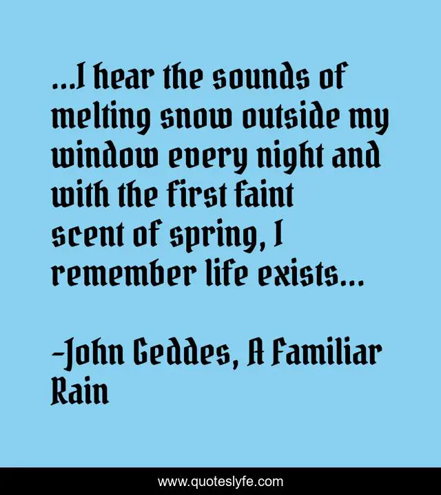 This page presents the quote "...I hear the sounds of melting snow outside my window every night and with the first faint scent of spring, I remember life exists...". Author of this quote is John Geddes, A Familiar Rain. This quote is about seasons, life, contentment, winter, spring,.