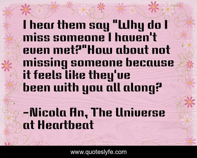 This page presents the quote "I hear them say "Why do I miss someone I haven't even met?"How about not missing someone because it feels like they've been with you all along?". Author of this quote is Nicola An, The Universe at Heartbeat. This quote is about missing-you, love, past-lives, mystic, soulmates, souls, metaphysics, twin-flames, the-universe-at-heartbeat,.