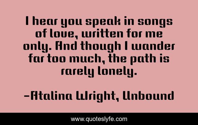 This page presents the quote "I hear you speak in songs of love, written for me only. And though I wander far too much, the path is rarely lonely.". Author of this quote is Atalina Wright, Unbound. This quote is about writing-life, love, affection, writing,.