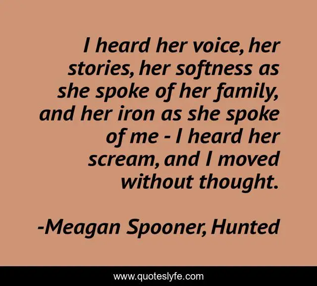 "Meagan Spooner, Hunted Quotes." Quoteslyfe.com, 2025. Mon. 08 Dec. 2025. <https://www.quoteslyfe.com/quote/I-heard-her-voice-her-stories-her-60897>.