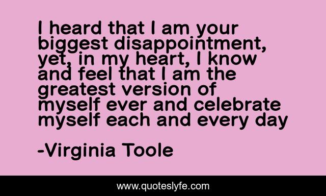 This page presents the quote "I heard that I am your biggest disappointment, yet, in my heart, I know and feel that I am the greatest version of myself ever and celebrate myself each and every day". Author of this quote is Virginia Toole. This quote is about heart, life, motivate, disappointment, inspirational, enthusiasm, celebrate, greatest,.