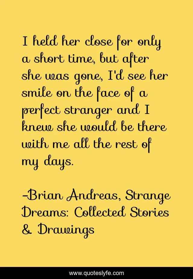 This page presents the quote "I held her close for only a short time, but after she was gone, I'd see her smile on the face of a perfect stranger and I knew she would be there with me all the rest of my days.". Author of this quote is Brian Andreas, Strange Dreams: Collected Stories & Drawings. This quote is about forever, death,.
