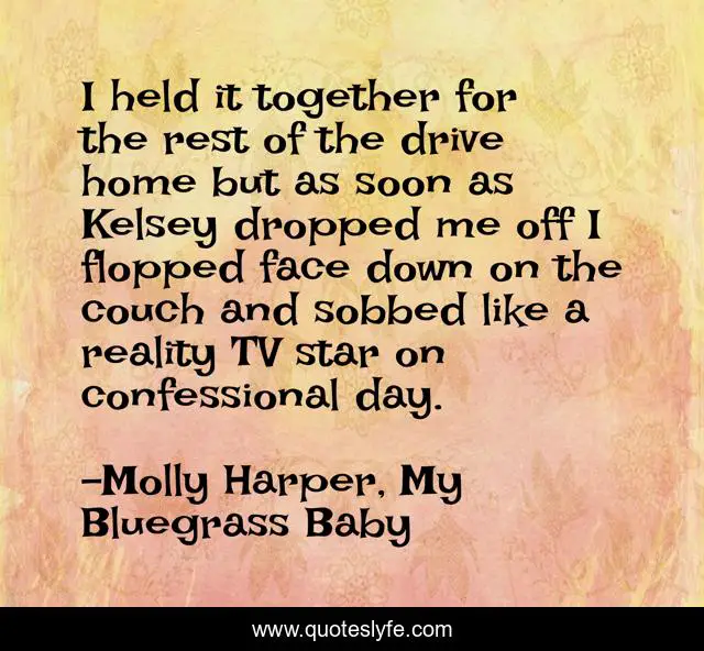 This page presents the quote "I held it together for the rest of the drive home but as soon as Kelsey dropped me off I flopped face down on the couch and sobbed like a reality TV star on confessional day.". Author of this quote is Molly Harper, My Bluegrass Baby. This quote is about contemporary-comedy, contemporary-romance,.