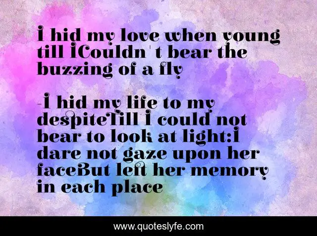 This page presents the quote "I hid my love when young till ICouldn't bear the buzzing of a fly". Author of this quote is I hid my life to my despiteTill I could not bear to look at light:I dare not gaze upon her faceBut left her memory in each place. .