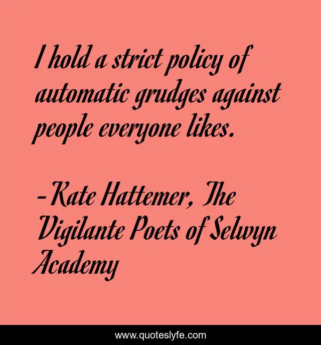 This page presents the quote "I hold a strict policy of automatic grudges against people everyone likes.". Author of this quote is Kate Hattemer, The Vigilante Poets of Selwyn Academy. This quote is about grudges, popular, friendships, people, relationships,.