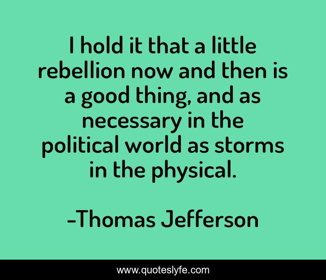 This page presents the quote "I hold it that a little rebellion now and then is a good thing, and as necessary in the political world as storms in the physical.". Author of this quote is Thomas Jefferson. This quote is about politics, revolution, democracy, rebellion,.