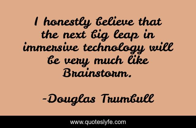 This page presents the quote "I honestly believe that the next big leap in immersive technology will be very much like Brainstorm.". Author of this quote is Douglas Trumbull. This quote is about leap, believe,.