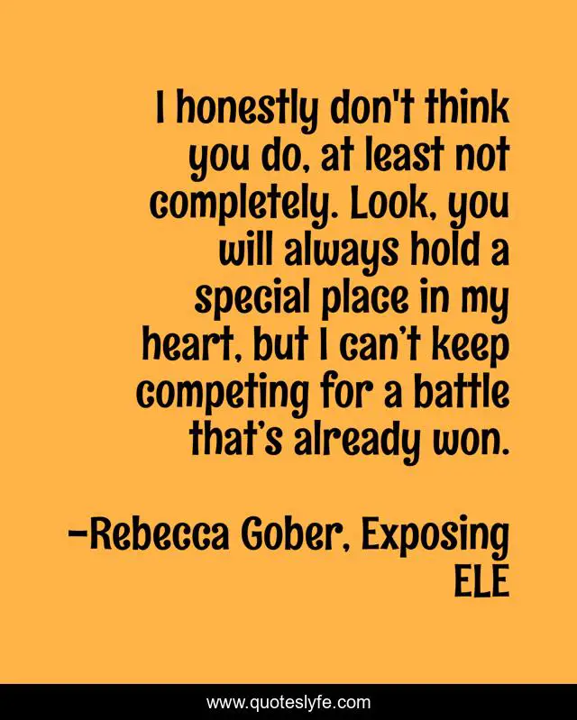 This page presents the quote "I honestly don't think you do, at least not completely. Look, you will always hold a special place in my heart, but I can’t keep competing for a battle that’s already won.". Author of this quote is Rebecca Gober, Exposing ELE. This quote is about heart-break, hurt, exposing-ele, love-hurts,.