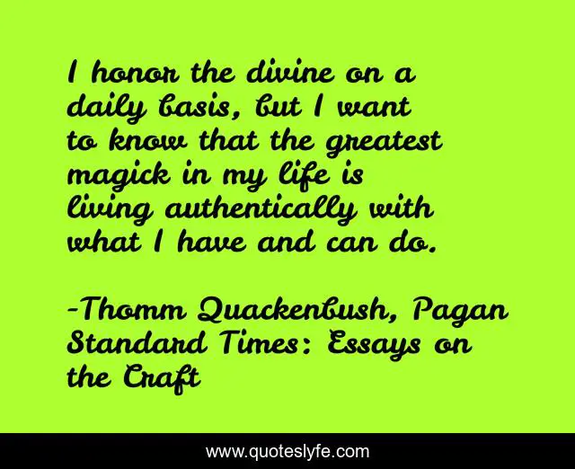 This page presents the quote "I honor the divine on a daily basis, but I want to know that the greatest magick in my life is living authentically with what I have and can do.". Author of this quote is Thomm Quackenbush, Pagan Standard Times: Essays on the Craft. This quote is about living, life, magick, divine, authentic, worship,.