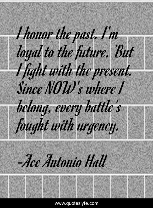 This page presents the quote "I honor the past. I'm loyal to the future. But I fight with the present. Since NOW's where I belong, every battle's fought with urgency.". Author of this quote is Ace Antonio Hall. This quote is about quote, inspirational, enthusiasm,.