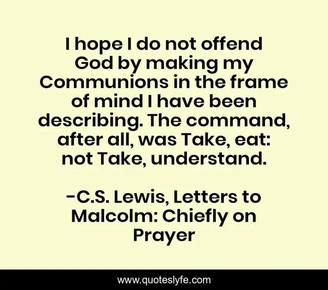 This page presents the quote "I hope I do not offend God by making my Communions in the frame of mind I have been describing. The command, after all, was Take, eat: not Take, understand.". Author of this quote is C.S. Lewis, Letters to Malcolm: Chiefly on Prayer. This quote is about holy-communion, christianity,.