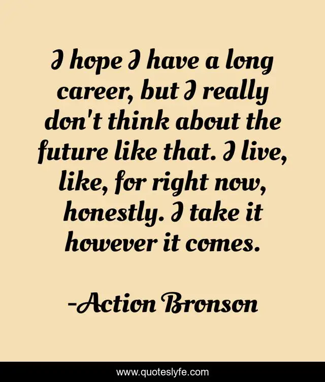 This page presents the quote "I hope I have a long career, but I really don't think about the future like that. I live, like, for right now, honestly. I take it however it comes.". Author of this quote is Action Bronson. This quote is about live, future, long,.