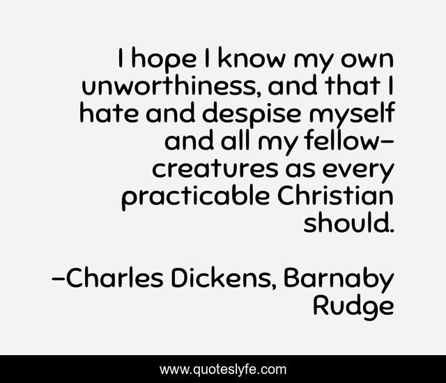 This page presents the quote "I hope I know my own unworthiness, and that I hate and despise myself and all my fellow-creatures as every practicable Christian should.". Author of this quote is Charles Dickens, Barnaby Rudge. This quote is about humorous, irony, ironic-humor, christians,.