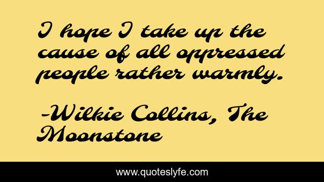 This page presents the quote "I hope I take up the cause of all oppressed people rather warmly.". Author of this quote is Wilkie Collins, The Moonstone. This quote is about the-moonstone, wilkie-collins, mgg, service,.