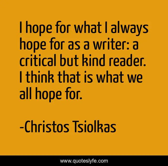 This page presents the quote "I hope for what I always hope for as a writer: a critical but kind reader. I think that is what we all hope for.". Author of this quote is Christos Tsiolkas. This quote is about authors, readers, writers, writing,.