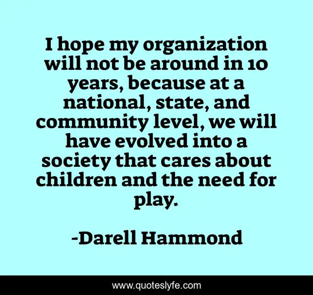 This page presents the quote "I hope my organization will not be around in 10 years, because at a national, state, and community level, we will have evolved into a society that cares about children and the need for play.". Author of this quote is Darell Hammond. This quote is about society, children, community,.