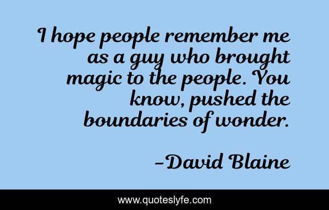 This page presents the quote "I hope people remember me as a guy who brought magic to the people. You know, pushed the boundaries of wonder.". Author of this quote is David Blaine. This quote is about me, remember, people,.