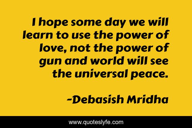 This page presents the quote "I hope some day we will learn to use the power of love, not the power of gun and world will see the universal peace.". Author of this quote is Debasish Mridha. This quote is about life, love, knowledge, inspirational, intelligence, philosophy, wisdom, quotes, affection,.
