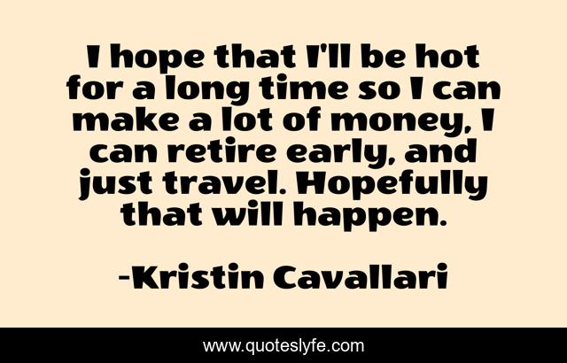 This page presents the quote "I hope that I'll be hot for a long time so I can make a lot of money, I can retire early, and just travel. Hopefully that will happen.". Author of this quote is Kristin Cavallari. This quote is about money, hope, time,.