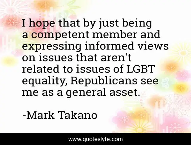 This page presents the quote "I hope that by just being a competent member and expressing informed views on issues that aren't related to issues of LGBT equality, Republicans see me as a general asset.". Author of this quote is Mark Takano. This quote is about me, see, hope,.