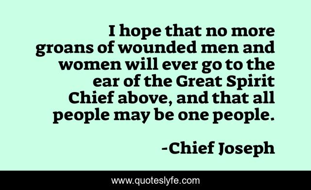 This page presents the quote "I hope that no more groans of wounded men and women will ever go to the ear of the Great Spirit Chief above, and that all people may be one people.". Author of this quote is Chief Joseph. This quote is about great, men, women,.