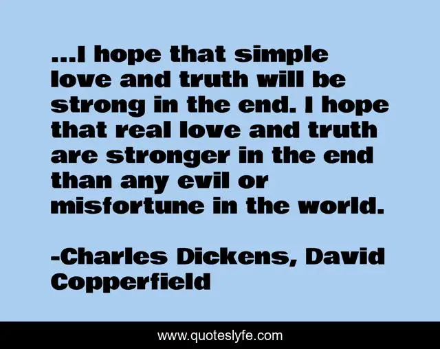This page presents the quote "...I hope that simple love and truth will be strong in the end. I hope that real love and truth are stronger in the end than any evil or misfortune in the world.". Author of this quote is Charles Dickens, David Copperfield. This quote is about strength, love, truth, affection,.