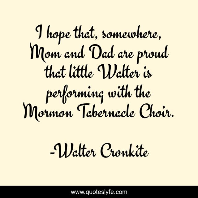 This page presents the quote "I hope that, somewhere, Mom and Dad are proud that little Walter is performing with the Mormon Tabernacle Choir.". Author of this quote is Walter Cronkite. This quote is about little, proud, hope,.