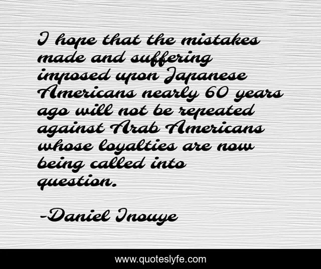 This page presents the quote "I hope that the mistakes made and suffering imposed upon Japanese Americans nearly 60 years ago will not be repeated against Arab Americans whose loyalties are now being called into question.". Author of this quote is Daniel Inouye. This quote is about suffering, mistakes,.