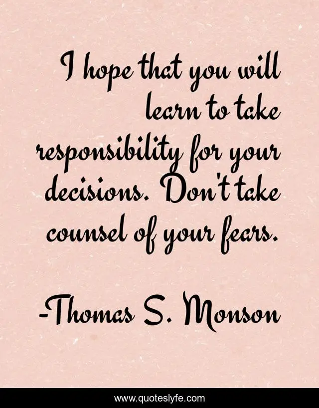This page presents the quote "I hope that you will learn to take responsibility for your decisions. Don't take counsel of your fears.". Author of this quote is Thomas S. Monson. This quote is about responsibility, decisions,.