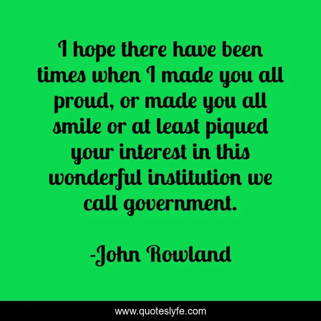 This page presents the quote "I hope there have been times when I made you all proud, or made you all smile or at least piqued your interest in this wonderful institution we call government.". Author of this quote is John Rowland. This quote is about proud, hope, government,.