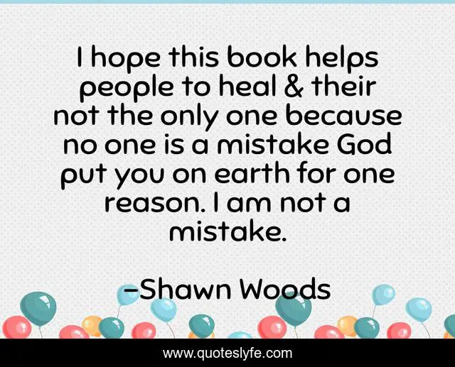 This page presents the quote "I hope this book helps people to heal & their not the only one because no one is a mistake God put you on earth for one reason. I am not a mistake.". Author of this quote is Shawn Woods. .