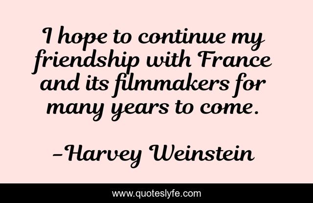 This page presents the quote "I hope to continue my friendship with France and its filmmakers for many years to come.". Author of this quote is Harvey Weinstein. This quote is about years, hope, france,.