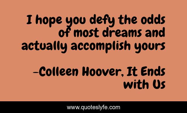This page presents the quote "I hope you defy the odds of most dreams and actually accomplish yours". Author of this quote is Colleen Hoover, It Ends with Us. This quote is about well-wishers, forgiveness, hope,.